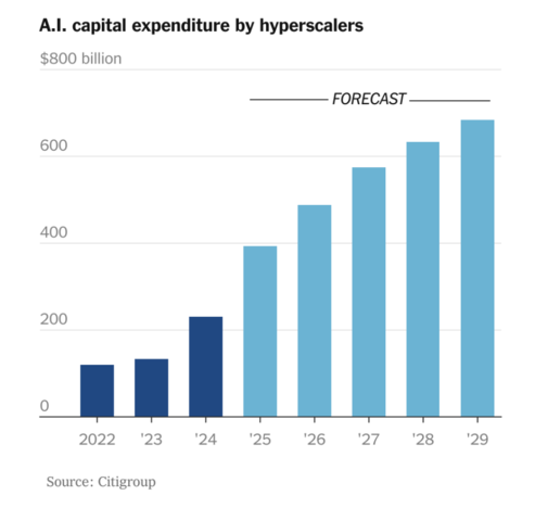 It’s also worth noting that Citigroup’s estimate applies only to the hyperscalers, the largest players in cloud computing. The so-called Big Three, Amazon, Microsoft, and Google, currently provide well over 60% of global cloud-compute capacity. But they’re not alone. Oracle, Meta, and others are also committing enormous sums to new data-center capacity.
